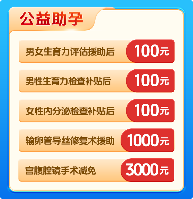 为减轻不孕不育家庭就医负担,郑州慈善总会送子公益基金为来院患者提供“优生及不孕普查保障型援助”和“疑难性不孕深度帮扶服务”。患者只需报名登记,即可通过免申报、直接补贴的方式,享受全方位的专属援助服务。点击在线咨询,免费申请补助