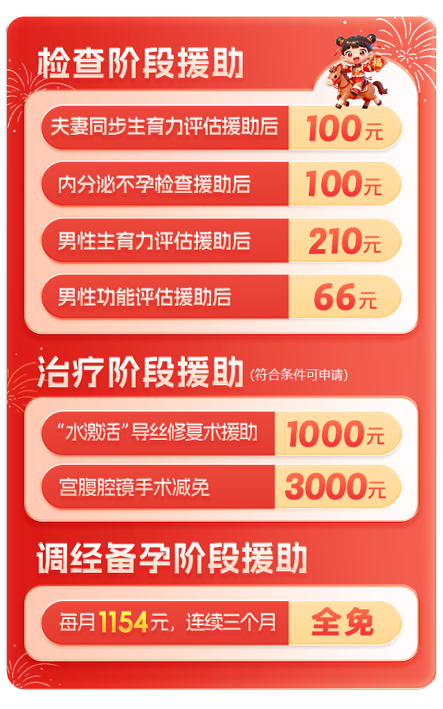 为切实减轻不孕不育家庭的就医负担,送子公益基金升级援助体系,特推出“一站式生育补贴:检查、会诊、治疗、助孕”全周期服务。这一创新模式打破了传统就医流程,实现“一次申请,全程补贴”的高效衔接。送子公益基金全程陪伴,全力护航,助您早日圆生育梦想。
